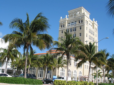 South Beach, view towards east from 15th Street near Washington Avenue with the Loews, St. Morritz and the Royal Palm Hotels in the background.