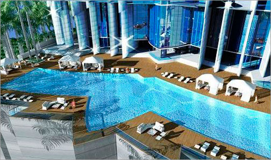 Oceanfront pool deck with spacious hot tub, pool services, pool bar, and children’s play room